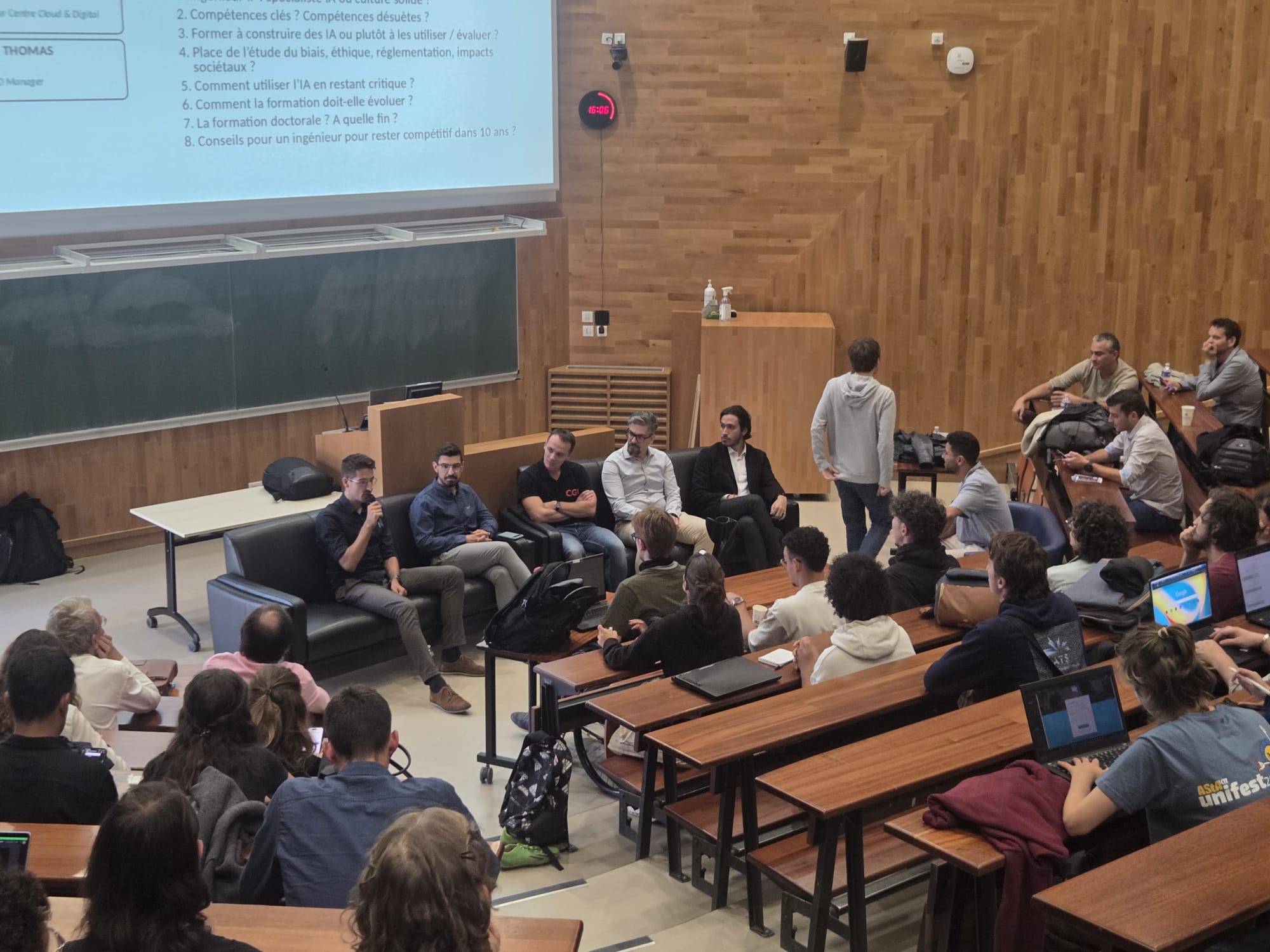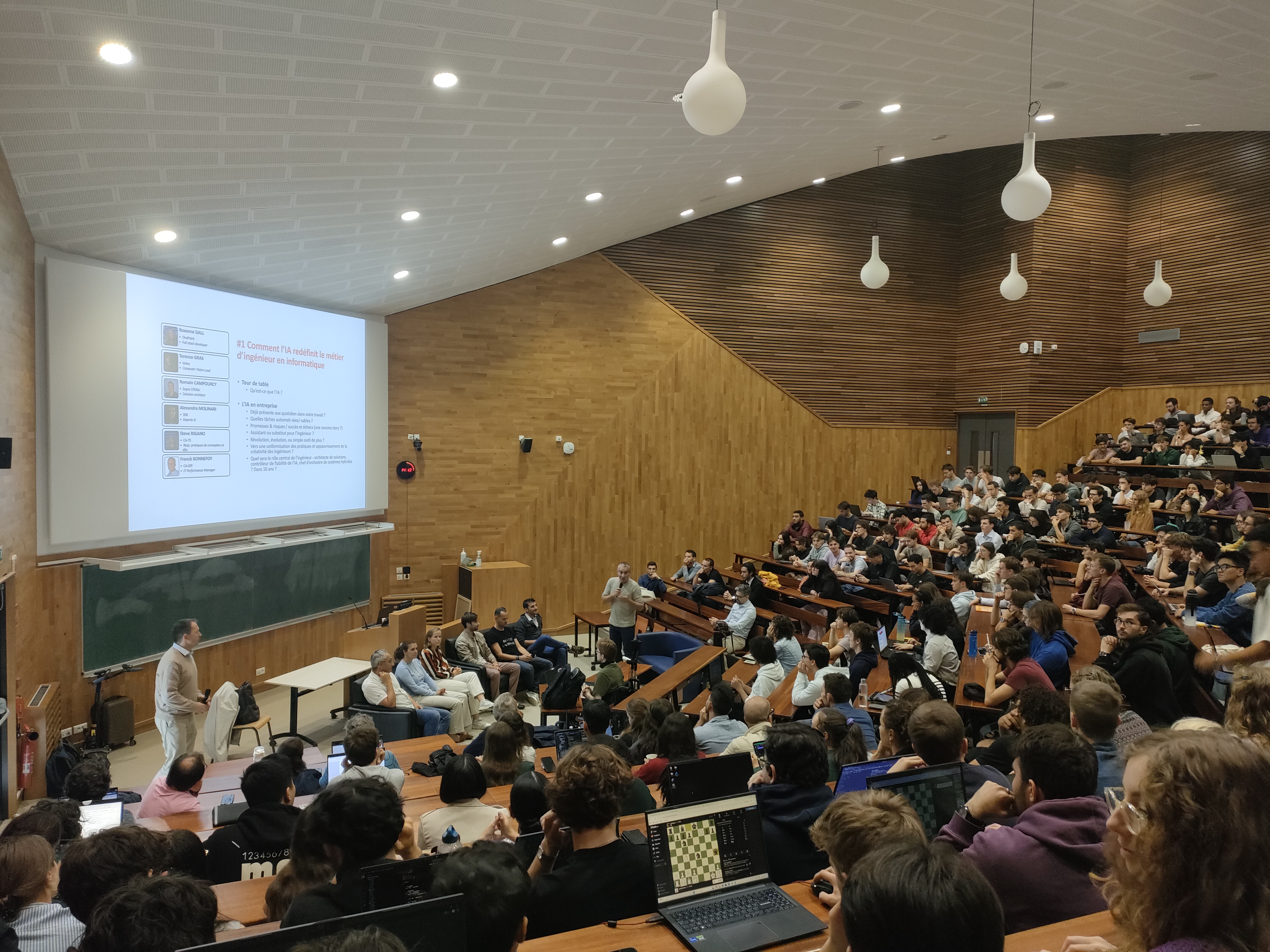 Deux tables rondes ont précédé les discoures officiels de la Direction et ont réuni des experts de Onepoint, Volvo, Sopra Steria, Seb, Crédit Agricole TS et GIP, Coexya, Deloitte, CGI, Hardis et Thales. Au cœur des échanges : l’impact de l’Intelligence Artificielle sur le métier d’ingénieur et sur la manière de préparer les talents de demain.